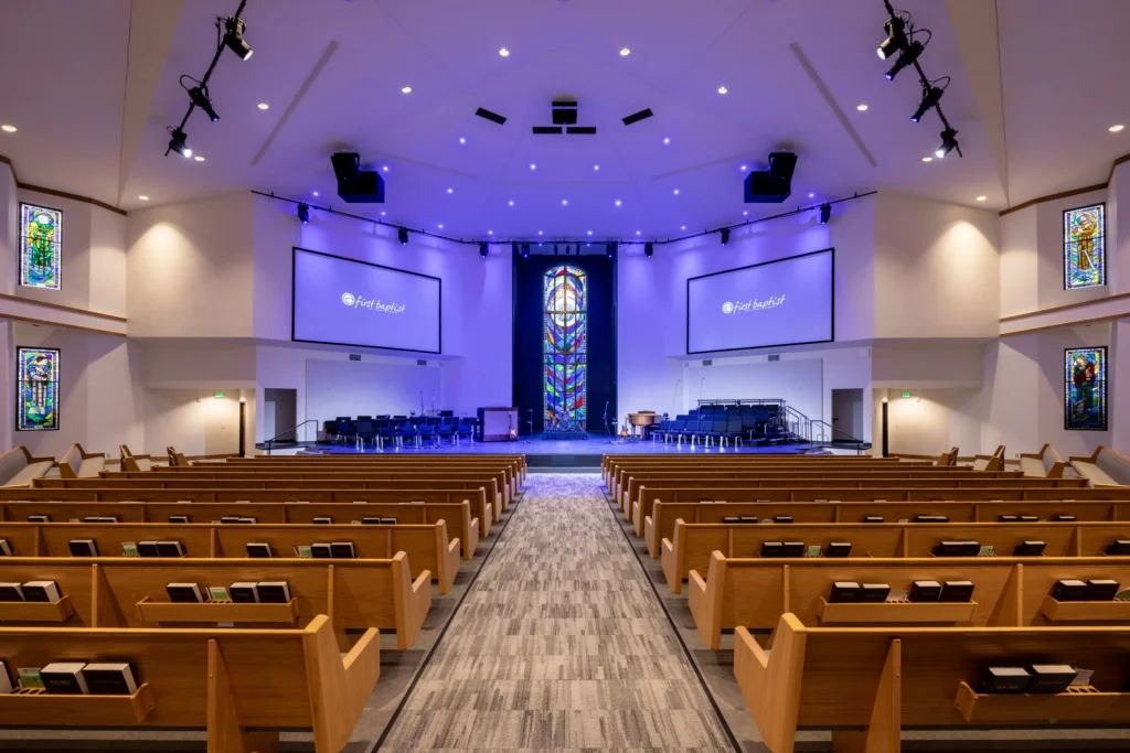 Construction at First Baptist Church Lee’s Summit is complete! This project included renovations to their worship room, lobby, kitchen, building hallways, and all HVAC systems.