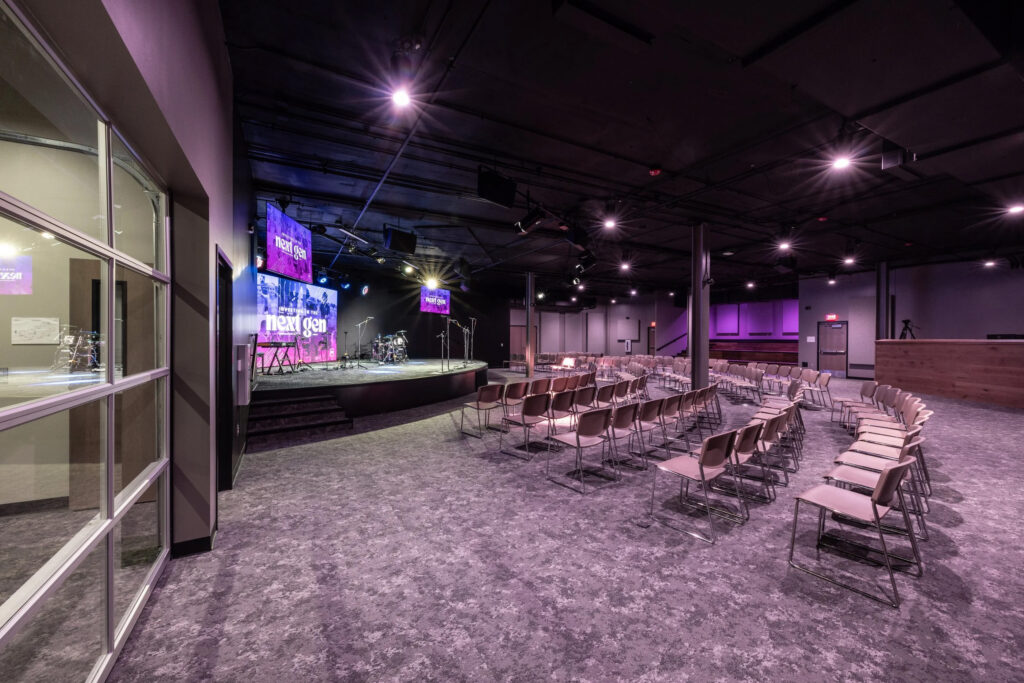 Construction at Pleasant Valley Baptist Church is complete! This project included renovations of their interior student spaces, creating a new worship venue, a dynamic hang-space, and an outdoor courtyard.